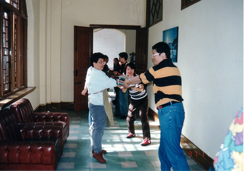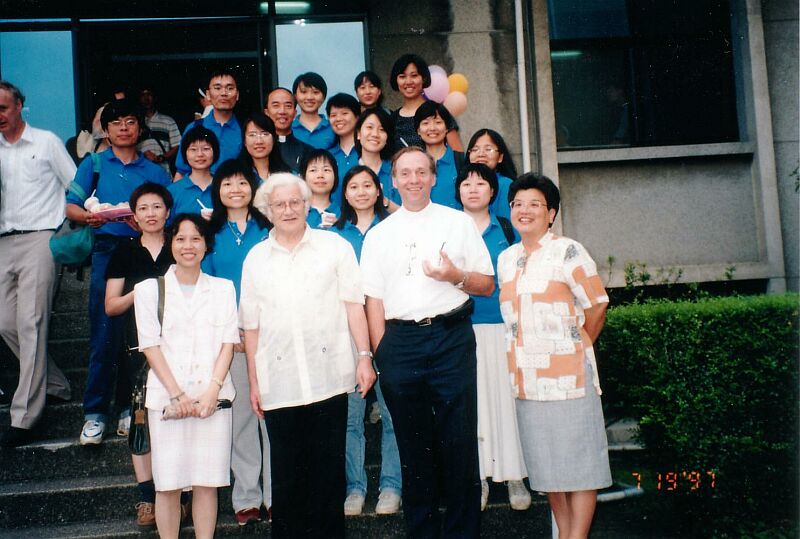 97年第一次台灣生活體驗「刻苦團」,巧遇黃懷秋教授(右一),跟著嚇一跳,溫保祿神父(左二)及詹德隆神父(左三)原來是外國人!(見識少,請勿見怪)